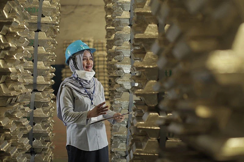 | Karyawan PT Timah Tbk di gudang penyimpanan produksi timah. Perseroan gencar memproduksi timah untuk meningkatkan cadangan bahan baku. Sumber foto: PT Timah Tbk. |