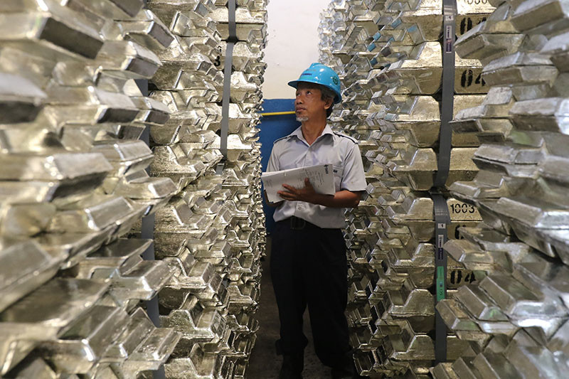 | Karyawan PT Timah Tbk sedang mencatat batang timah di ruang penyimpanan produk siap jual tersebut. Sumber foto: PT Timah Tbk |