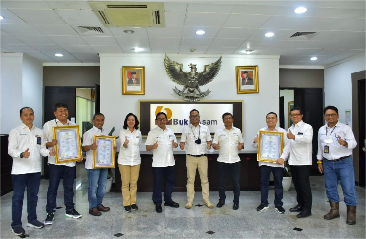 | Jajaran direksi PT Bukit Asam Tbk menerima penghargaan dari Kementerian Tenaga Kerja atas prestasi komitmen menerapkan SMK3. Sumber foto: Bukit Asam |