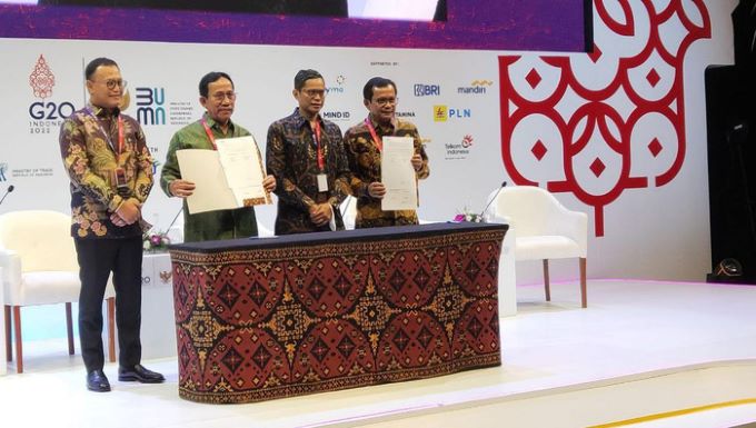 Penandatanganan Nota Kesepahaman (MoU) Pengembangan Energi Baru Terbarukan (EBT) Untuk Pembangkit Listrik Tenaga Surya oleh Direktur Utama PTBA Arsal Ismail dan Direktur Utama SIG Donny Arsal, yang disaksikan oleh Wakil Menteri BUMN I Pahala Nugraha Mansury dalam acara SOE International Conference 2022 di Nusa Dua, Bali, Selasa (18/10).