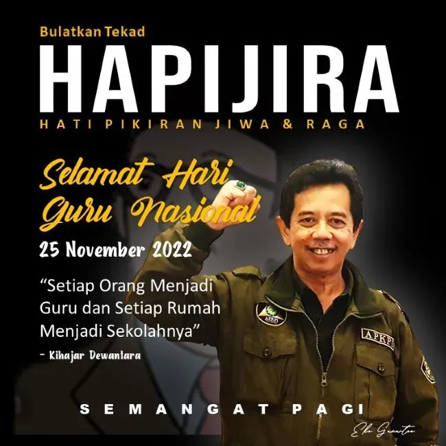 HomeHAPIJIRAHAPIJIRA: Selamat Hari Guru Nasional HAPIJIRA: Selamat Hari Guru Nasional Wong Jogja 25 November 0 A A Selamat Hari Guru Nasional, 25 November 2022 "Setiap orang menjadi guru, setiap rumah menjadi sekolahnya."-- Kihajar Dewantara--