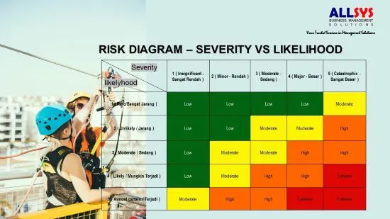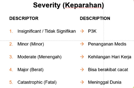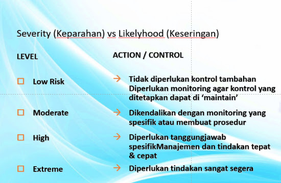 Penilaian risiko ditentukan atau di hitung dengan matrik perkalian antara Kemungkinan (Likelihood) berbanding dengan keparahan (Severity), bisa dilihat dari contoh matrix dibawah ini.