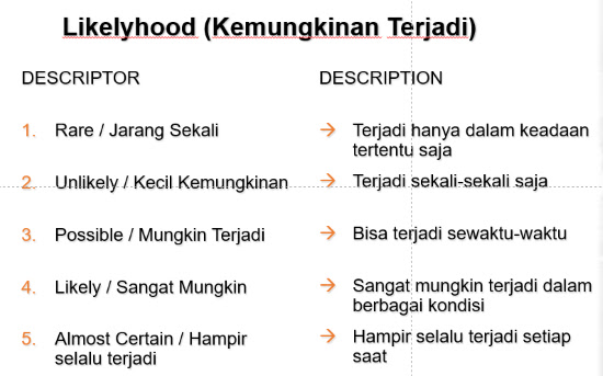 Deskripsi dari nilai kemungkinan tersebut di urutkan antara nilai 1 sampai dengan 5 dengan penjelasan sebagai berikut.