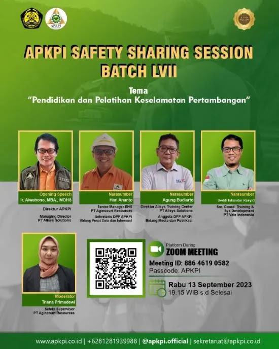 Demikian disampaikan Direktur Asosiasi Profesi Keselamatan Pertambangan Indonesia (APKPI), Ir. Alwahono, MBA., MOHS, saat menyampaikan open speech pada kegiatan Safety Sharing Session Batch LVII dengan tema "Pendidikan dan Pelatihan Keselamatan Pertambangan" secara daring. Rabu, 13 September 2023.