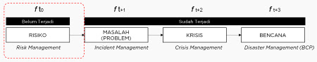 - Kep Dirjen Minerba KESDM No. 10.K/2023, Item Pengukuran Indikator Tingkat Kinerja No. 4.1.2 Perusahaan telah mengembangkan indikator risiko utama (key risk indicators) sebagai sistem peringatan dini (early warning system) di seluruh organisasi, telah terdapat perencanaan cadangan/alternatif/darurat (contingency planning) dalam berbagai skenario operasional. Metode manajemen risiko secara terus menerus dikembangkan mengacu kepada peraturan perundang-undangan dan mengikuti kemajuan ilmu pengetahuan dan teknologi. Tiap individu memiliki peran dalam pengendalian. Sampai di “Key Risk Indicator” atau indikator risiko utama biasanya perusahaan dapat menyampaikan buktinya, sebagai Top Risk perusahaan, namun sayang bukti pengembangannya tidak ada, selain dari hasil brainstorming para pimpinan departemen atau hasil kreativitas bagian HSE saja. Sedangkan berkenaan dengan early warning system dan contingency planning adalah siklus lanjutan dari manajemen risiko, jika digambarkan, mungkin, seperti gambar berikut: