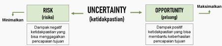 Kita tidak mengelola risiko sehingga kita tidak mempunyai risiko. Kita mengelola risiko sehingga kita tahu risiko mana yang pantas diambil, risiko mana yang akan membawa kita mencapai tujuan, risiko mana yang memiliki cukup keuntungan untuk diambil. Risiko yang membawa perusahaan mencapai tujuan adalah disebut sebagai risiko positif atau “Peluang/Opportunity”
