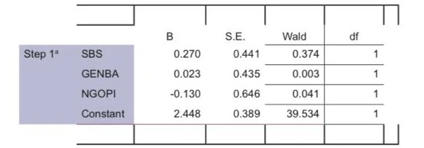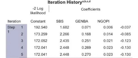 Tabel 1 di atas adalah tabel Iteration history Block 1 atau saat variabel independen belum dimasukkan dalam model dengan N = 333. Degree of Freedom (DF) =N-1=333 - 1= 332. Chi-Square (X2 ) Tabel Pada df 332 dan Probabilitas 0,05 = 375,49. Nilai -2 Log Likelihood (172,471) < X2 tabel (375,49) sehingga keputusan yang diperoleh adalah terima H0 , artinya model fit dengan data sebelum memasukkan variabel independen (SBS, Genba & Ngopi).