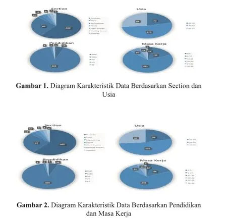 Berdasarkan Gambar 1 dan Gambar 2, dari 333 karyawan yang menjadi sampel penelitian, mayoritas karyawan berasal dari section Produksi (61%) dan Plant (26%) dengan rentang usia 20-30 tahun sebanyak 70 orang, usia 31-40 tahun sebanyak 175 orang dan 41-55 tahun sebanyak 88 orang. Mayoritas latar belakang pendidikan dari sampel adalah SMA sebanyak 304 karyawan dan karyawan terbanyak dengan masa kerja 11-15 tahun