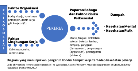 Bahaya psikososial di tempat kerja terkait tidak saja kondisi fisik, tetapi juga kaitannya dengan kondisi psikologis dan sosial di tempat kerja, seperti stres, kelelahan, intimidasi, kekerasan, agresi, pelecehan dan kelelahan akibat lembur, yang dapat berbahaya bagi kesehatan dan keselamatan pekerja dan mengancam kesejahteraan mereka. (lihat diagram di bawah). Misalnya, paparan bahaya psikososial yang parah dan akut seperti mengalami kekerasan di tempat kerja yang dapat mengakibatkan bahaya bagi kesehatan (misalnya gangguan stres akut, gangguan stres pascatrauma). Penting juga untuk mengenali bahwa efek kumulatif dari paparan tingkat rendah terhadap bahaya psikososial yang juga dapat menyebabkan gangguan psikologis atau cedera fisik.