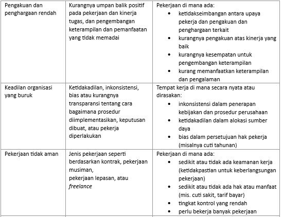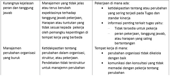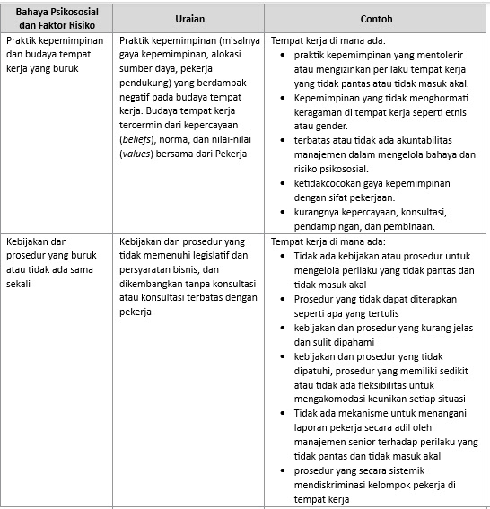 Tabel berikut menunjukkan bahaya-bahaya psikososial dan faktor risiko tempat kerja yang dapat menjadi pertimbangan penilaian di dalam proses pengelolaan risiko (risk management) perusahaan. Mungkin tidak semua dapat diterapkan untuk semua tempat kerja. Kuncinya ada di tahap identifikasi bahaya di dalam proses manajemen risiko.