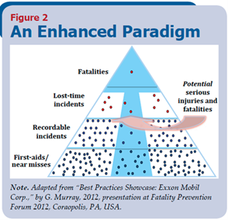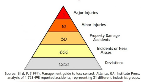 Sebagian besar dari kita sebagai Pengelola Keselamatan Pertambangan tentunya mengenal Segitiga Heinrich (1959) yang menampilkan komposisi 1:29:300. Segitiga ini memberi arti bahwa jika kita membiarkan 300 kecelakaan tanpa luka terjadi, maka akan terjadi 1 kecelakaan yang besar. Frank Bird melalui penelitiannya dengan menganalisis 1.753.498 laporan kecelakaan dari 21 industri. Hasilnya adalah komposisi baru dalam segitiga kecelakaan yaitu 1:10:30:600:1200 seperti gambar di bawah