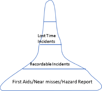 Kembali ke gambar piramida di atas, coba sesekali melakukan analisis mendalam terhadap kecelakaan yang terjadi di area kerja masing-masing. Mungkin saja bentuk piramida akan seperti gambar di bawah ini. Bentuk piramida ramping di tengah. Hazard Report dilakukan dengan baik, mungkin ribuan atau puluhan ribu laporan tindakan atau kondisi tidak aman diterima bagian Admin K3.