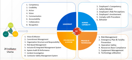 Seperti yang tertera pada gambar dibawah ini terdapat pendekatan sebanyak 28 sebagai indikator utama dari 4 frame work utama yang terdiri dari kepemimpinan (leadershhip), organisasi dan system manajemen, kemampuan manuasia (Human Capability), dan terakhir adalah proses dan teknologi. Penjabaran dari 4 frame work utama yang di break down ke dalam 28 indikator utama bisa di lihat pada gambar dibawah ini: