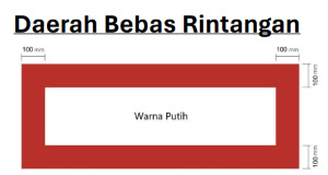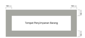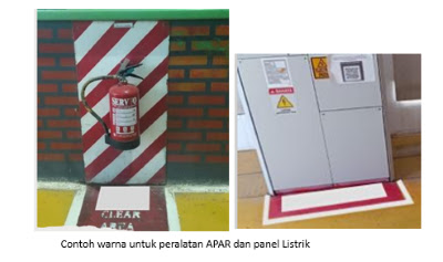 Daerah bebas rintangan di area penyimpanan peralatan pemadam kebakaran harus diberi demarkasi berupa garis warna merah tua (kode R13 Signal Red) dengan lebar 100 mm dan bagian tengah diberikan warna