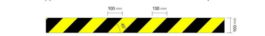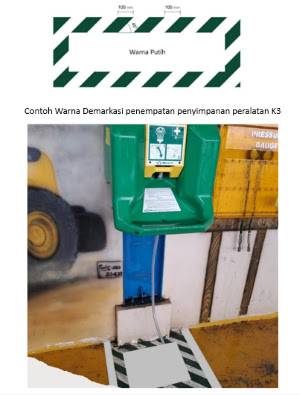 Daerah Tempat Penyimpanan Peralatan K3 Daerah tempat penyimpanan peralatan K3 dan KO harus diberi demarkasi berupa garis setrip warna putih-hijau (kode G21 Jade) selebar 100 mm dengan kemiringan 45° dan pada bagian tengah diberikan warna putih