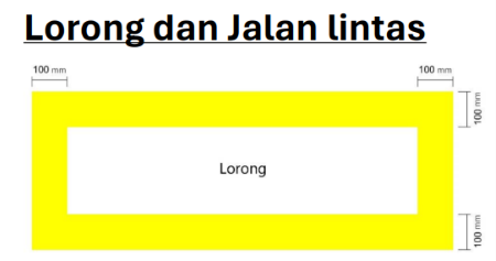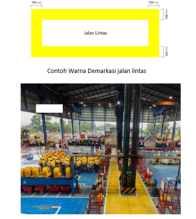 jalan yang disediakan untuk orang di area bengkel atau pabrik Seluruh lorong harus diberi demarkasi berupa garis warna kuning terang (kode Y15 Sunflower) dengan lebar 100 mm (lihat Gambar 1). Seluruh lorong harus diberi demarkasi berupa garis warna kuning terang (kode Y15 Sunflower) dengan lebar 100 mm